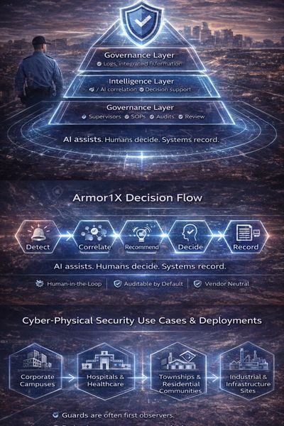 Modern security failures rarely occur due to lack of technology—they occur due to fragmented systems, poor coordination, and unclear accountability. Armour1X addresses this through a Cyber-Physical Operating Model that integrates physical security, digital systems, AI-assisted intelligence, and human governance into a single, accountable framework.